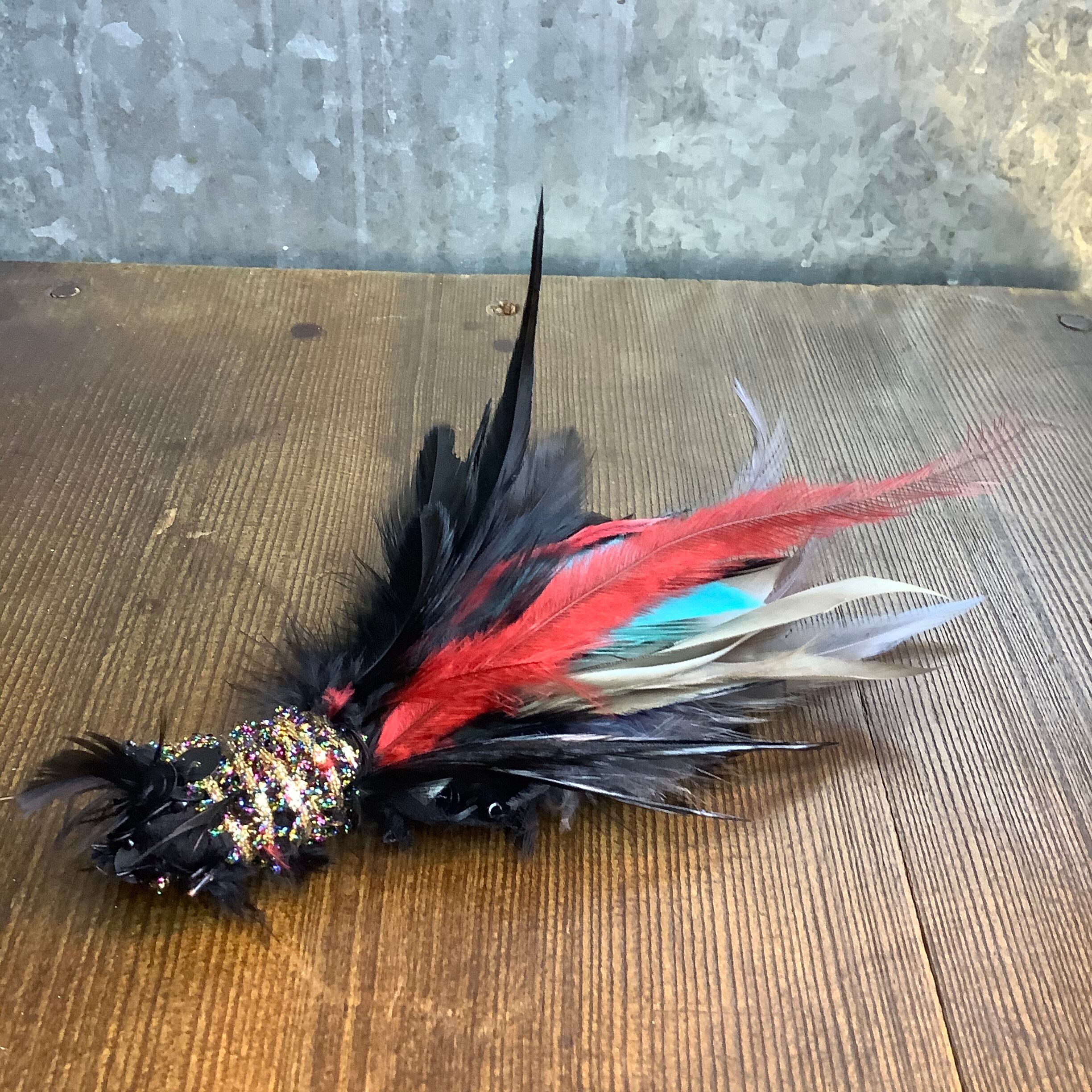 黒、赤、グレー、ブルーのカラフルな羽を組み合わせたハットピンです。キャスケットやクロッシェに着ければ、より個性的で「動き」のあるコーディネートになります。アンサンブルに着けることも可能です。