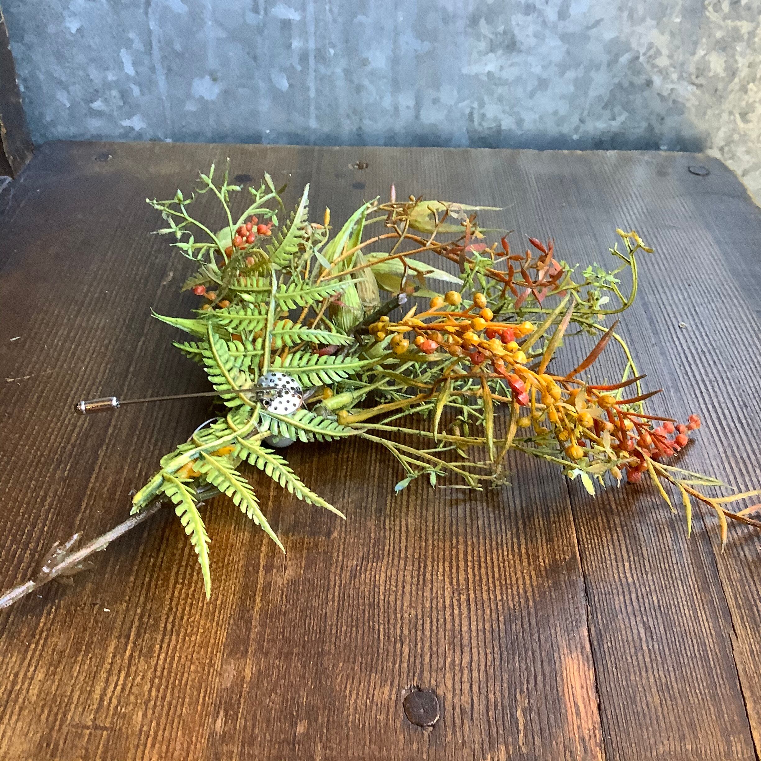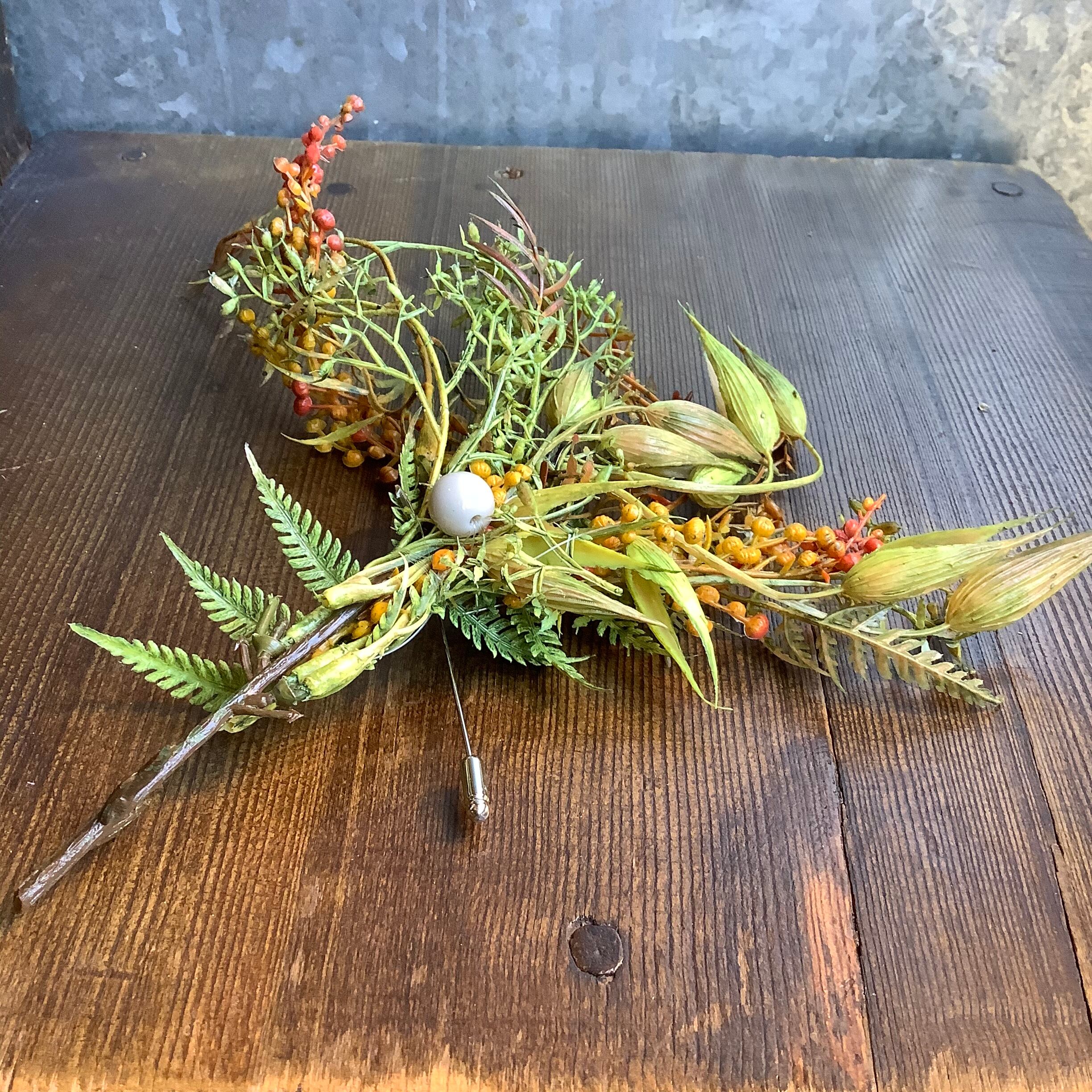 模造植物を使ったワイルドで遊び心のあるハットピンです。キャスケットやクロッシェに着ければ、より個性的で「動き」のあるコーディネートになります。アンサンブルに着けることも可能です。このハットピンは模造植物シリーズの中では、大きめのサイズになります。