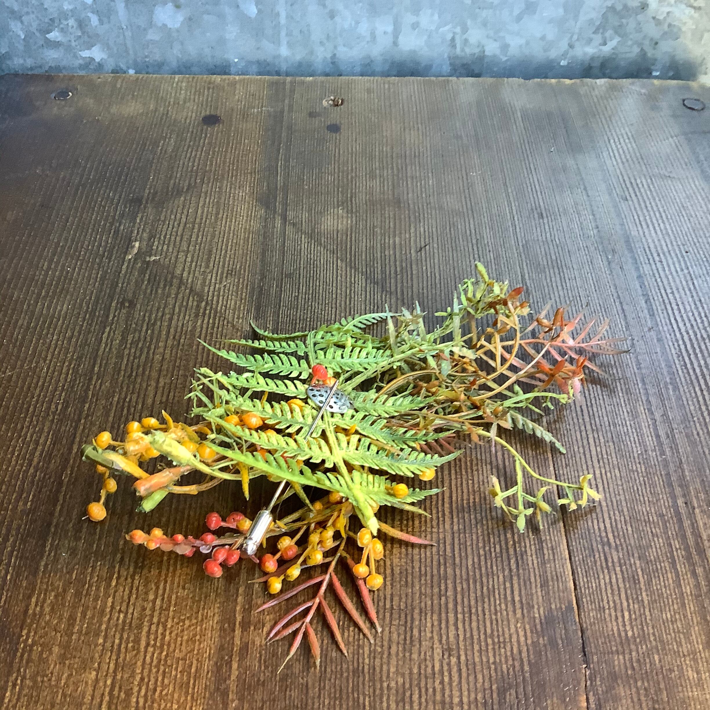 模造植物を使ったワイルドで遊び心のあるハットピンです。キャスケットやクロッシェに着ければ、より個性的で「動き」のあるコーディネートになります。アンサンブルに着けることも可能です。このハットピンは模造植物シリーズの中では中位サイズになります。