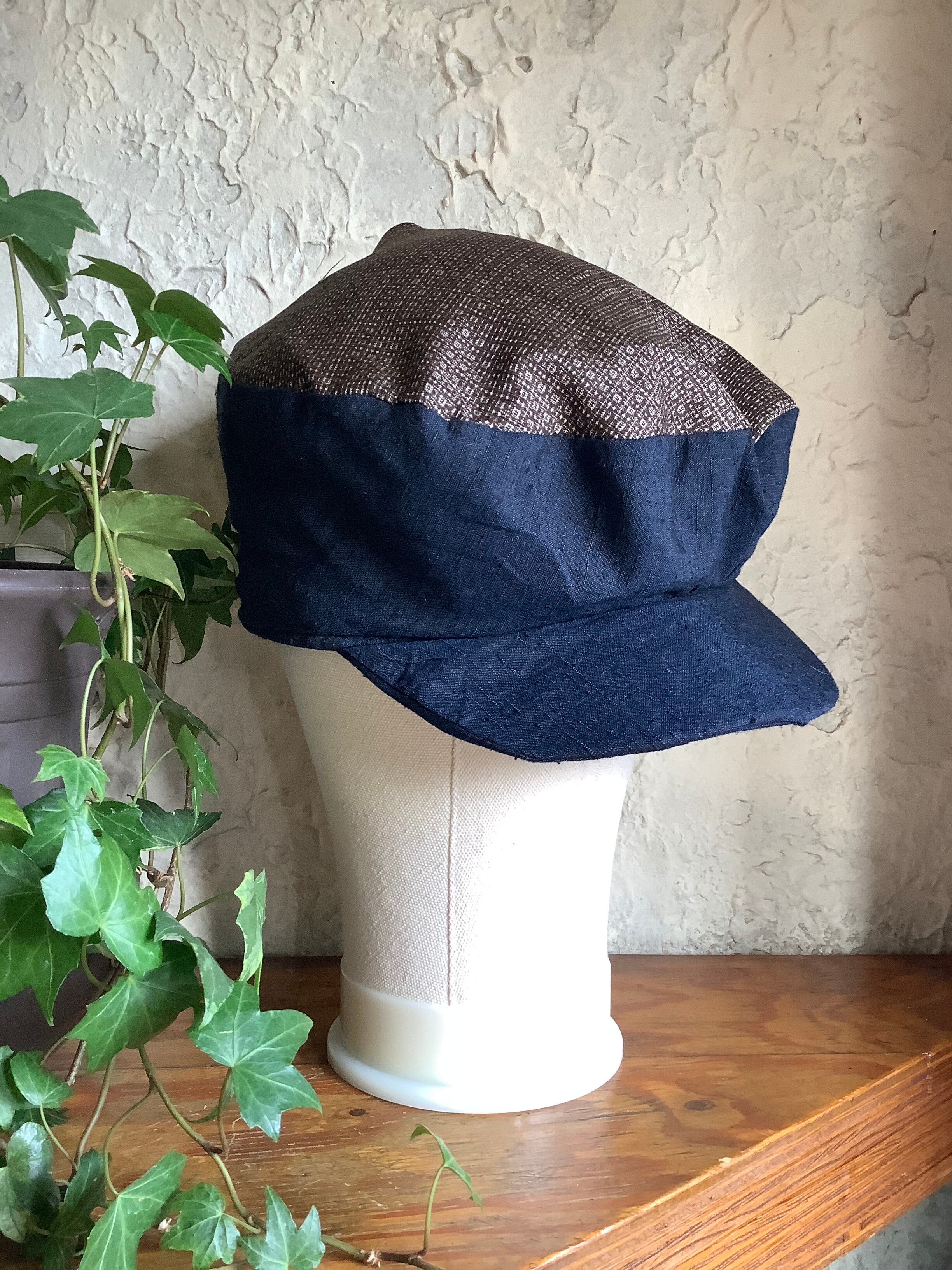 トップとブリム(ツバ)に絹100%の紬を用いたキャスケットです。トップクラウンには茶色のチェック柄の紬を、サイドクラウンとブリムには紺色の紬を使用しています。