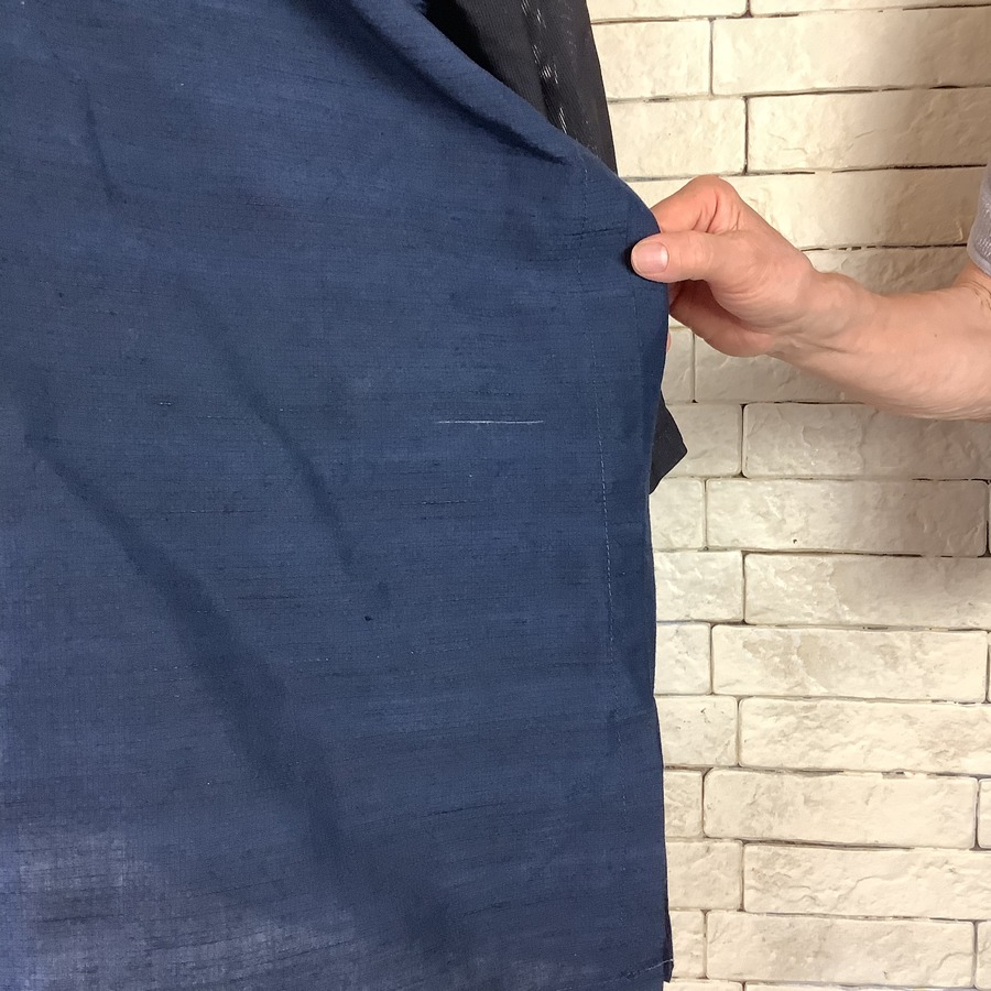 こちらのワンピースは2種類の反物で作られています。見頃に使われている反物は、濃紺色の男性用の絹100%の反物で、女性用より反物の幅が5センチ程長くなっています。ゆえに、ワンピースも他の物よりおおよそ8センチ程(片側4センチ程)幅広く作られていて、「ダボっと」着こなします。また、通常の紬よりも厚みもあり、重厚感があります。